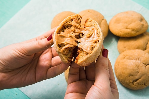 Önce iç harcı yapmakla başlayın. Orta uzunluk bir kapta fıstık ezmesi ve pudra şekerini pürüzsüz olana kadar karıştırın. Küçük toplar halinde yağlı kağıda alıp kullanıma hazır olana kadar buzlukta dondurun. Geniş bir kapta fıstık ezmesi, tereyağı ve şekeri mikser yardımıyla çırpın. Yumurta ve vanilyayı ekleyin ve güzelce birleşene kadar karıştırın, akabinde un, kabartma tozu ve tuzu ekleyin ve birleşene kadar karıştırın. Kurabiye hamurundan bir ceviz büyüklüğünde ve elinizle daire formunda düzleştirin. Dondurulmuş fıstık ezmesi topunu üstüne yerleştirin. Hamurun kenarlarını fıstık ezmesi topunun etrafına getirin ve kenarlarını sıkıştırmak için sıkıştırın, gerekirse donmuş fıstık ezmesini büsbütün kaplamak için daha fazla hamur ekleyin.