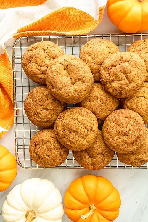 Fırını 175 derecede evvelce ısıtın. Büyük bir kapta, tereyağını toz şeker ve esmer şekerle krema kıvamı alana kadar çırpın. Pürüzsüz olana kadar kabak püresi, yumurta ve vanilyayı ekleyip çırpmaya devam edin. Ayrı bir kapta un, kabartma tozu, karbonat, tarçın, muskat, karanfil ve tuzu karıştırın. Islak gereçleri kuru materyallerle birleştirin. Birleşene kadar büyük bir spatula ile karıştırın. Yağlı kağıt serili fırın tepsisine dondurma kaşığı yardımıyla kurabiye hamurlarından alıp dizin. Toz şeker ve tarçını küçük bir kapta karıştırın. Karışımı kurabiyelerin üzerine eşit olarak serpin. Kenarları şişene ve yavaşça kızarana kadar 12 dakika pişirin.