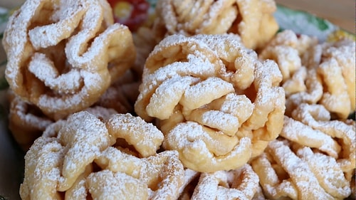 Tüm materyalleri geniş bir kapta güzelce yoğurun. Kabın üzerini kapatıp en az 1 saat dinlendirin. Dinlenen hamuru unlanmış tezgahta 1 parmak kalınlığında merdane yardımı ile açın. Açtığınız hamurları şeritler halinde kesin. Elinizi unlayarak kestiğiniz şeritleri itinasız biçimde birbirinin içinden geçirerek avucunuzun içerisinde toplayın. Avucunuzdaki hamur topunu bir kevgir yardımıyla kızgın yağda kızartın. Pudra şekeri ile süsleyip servis edebilirsiniz.