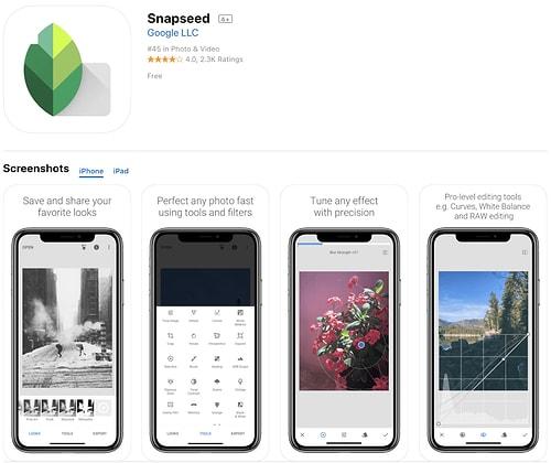 Google'ın kendi aplikasyonu Snapseed, bilhassa kullanıcı arayüzü tasarımı ile dikkat çekiyor.
