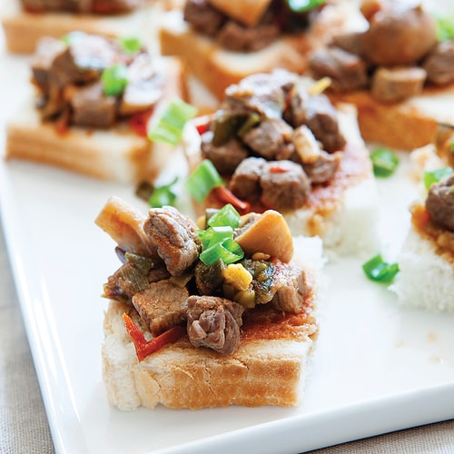 Taze soğanı ayıklayıp doğradıktan sonra tencerede ada çayı yaprağı ve 4 çorba kaşığı zeytinyağı ile pembeleştirin. Kuşbaşı doğranmış eti ekleyip birlikte soteleyin. Doğranmış domates ve mantarı ek edip bir tutam tuz serpin. Orta ateşte 45 dakika pişirip orta ara karıştırın. Eğer gerekliyse sıcak zerzevat suyu ve et suyunu da ek ederek yemeğin sulanmasını sağlayın. Pişirip başka bir kaba alın. Servis için ısıtın. Üçgen kesilmiş ve kızartılıp tereyağı sürülmüş tost ekmeği ile servis yapın.