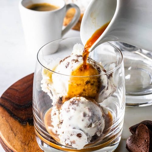 İnce çekilmiş kahveyi espresso makinesinin içerisine aktarın. Makinenin talimatlarına uygun olarak su ek edin. Akabinde altına bardaklarınızı koyun ve demlenmeye bırakın. Demlendikçe bardakların içerisine damlayacak ve nefis bir hal alacaktır. Demlenen ve bardakların içerisine damlayan espresso’yu alın. Şimdi sıcakken içerisine birer top vanilyalı dondurma koyun. Dilerseniz üzerine biraz daha espresso ek edin. Afiyetle tüketin.