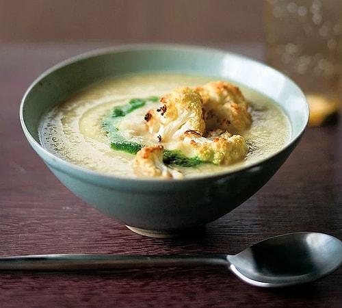 Karnabaharın yapraklarını ve sert göbeğini kesip çıkartın. Geriye kalan modülleri parmak kalınlığında doğrayıp bir kenara ayırın. Hepsinin eşit derecede pişmesi için kesimlerin boyutlarının birbirine yakın olmasına itina gösterin. Büyük bir tencerede tereyağını eritip soğanları ekleyin ve soğanlar yumuşayıp saydamlaşana kadar kavurun. Üzerine doğradığınız karnabahar kesimlerini, 1 tatlı kaşığı tuz, yarım tatlı kaşığı taze çekilmiş karabiber ve yarım tatlı kaşığı köri ekleyip orta sıra karıştırarak, yumuşayana kadar, yaklaşık 20 dakika boyunca pişirin. Süt, krema ve suyu ekleyip orta yüksek ateşte kaynama noktası getirin, altını kısıp orta sıra zirvede toplanan köpüğünü almak suretiyle 30 dakika boyunca pişirin. Bir el blenderı yardımıyla (ya da rondoda) püre kıvamına getirdikten sonra ince delikli bir kevgirden geçirip pak bir tencereye aktarın. Bu evrede çorba hazır sayılır. Zevkinize nazaran kıvamını ayarlayabilirsiniz. Şayet daha akışkan bir çorba isterseniz su eklemesi yapabilirsiniz. Unutmayın, çorbayı son kere ısıtırken suyun bir kısmı buharlaşıp yoğunlaşacaktır. Kıvamını ayarlamayı bitirince tadına bakın ve tuzunu tekrar ayarlayın (su ekledikçe tuz da eklemek gerekecektir). O esnada küp küp doğradığınız ekmek kesimlerini bir fırın tepsisine yayıp fırında kızarmaya bırakın. Zeytinyağını ufak uzunluk bir tencerede kızdırdıktan sonra altını biraz kısıp havuç dilimlerini çok kalabalık yapmayacak halde birer avuçluk porsiyonlar olarak kızartmaya başlayın (dikkatli olun, yağ sıçrayabilir). Birinci eklediğinizde çıkan cızırtılar bitince ve havuçların kenarları kıvrılıp koyu bir renk almaya başladığında pişti demektir. Bir kağıt havluya aktarıp fazla yağını alın. Çorbayı servis kaselerine bölüp kızarmış ekmekleri ortasına yerleştirin. Onların da doruğuna çorbaya değmeyecek halde havuç dilimlerini dizip servis yapın.
