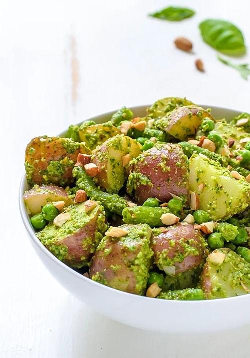 Patatesleri kabuklarıyla birlikte haşlayın. Patatesleri süzün. Patatesleri haşladığınız suyun içine bezelyeleri koyun ve 3 dakika haşlayın. Haşladıktan sonra soğuk su altında yıkayın. Mutfak robotuna roka, 1/3 su bardağı badem, fesleğen, 1 yemek kaşığı limon suyu ve tuzu koyup çekin. Yavaşça zeytinyağını ekleyip çekmeye devam edin. Patatesler ılıkken sosu patateslerin üzerinden gezdirin. Bezelyeleri ekleyin. Limon suyunu sıkın. 2 yemek kaşığı bademi serpin. Tuzla tatlandırıp servis edin.