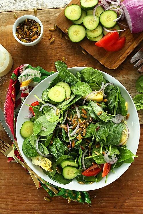 Servisten iki saat evvel ıspanak yapraklarını 2- 3 sefer yıkayıp ayıklayın. Her bir yaprağı elinizle 2 yahut 3 modüle bölün. Nar ekşisini ortada ıspanağın tadının denetim ederek ekleyin. Tuz serpin. Zeytinyağı gezdirin. Kabak çekirdeğini, domatesi, salatalığı, soğanı ve yeşillikleri ek edip karıştırın. 2 saat buzdolabında dinlendirip servis yapın.