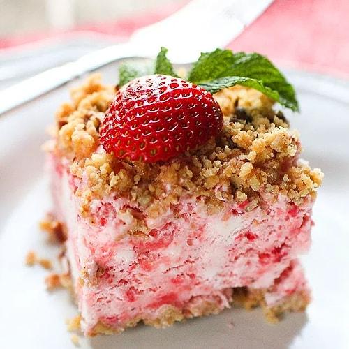 Un, kahverengi şeker, kıyılmış fındık ve eritilmiş tereyağını karıştırın. Karışımı fırın tepsisine alıp 18 derecelik ısıtılmış fırında orta sıra karıştırarak 20 dakika kadar pişirin. Fırından çıkarın ve soğuyana kadar dinlendirin.Yumurta akı, şeker, çilek ve limon suyunu büyük bir kapta birleştirin. Sertleşene kadar çırpın. Kalan başka materyalleri de karıştırın. Unlu karışımın yarısını servis tabağının tabanına yayın ve üzerine tatlı karışımını dökün. En üste kalan unlu karışımı da yayın ve 6 saat boyunca buzdolabında bekletin. İsterseniz üzerini çilekle süsleyerek servis edebilirsiniz.