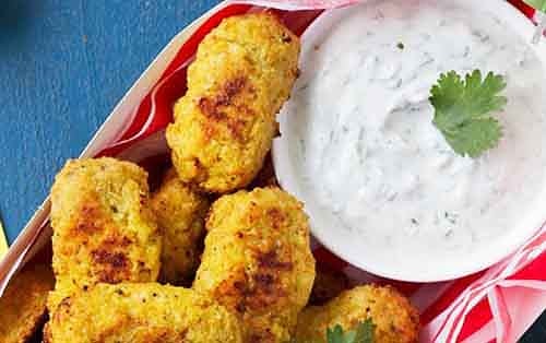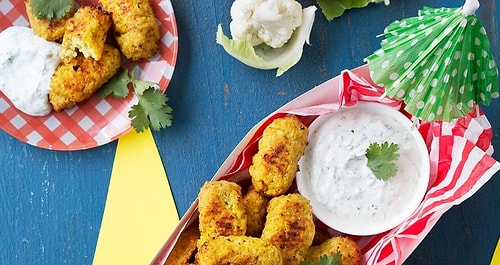 Fırını evvelden 190 dereceye ısıtın. Fırın tepsisine yağlı kağıt koyun. Karnabaharı küçük çiçeklere kesin ve yumuşayana kadar haşlayın. Pişmiş karnabaharı bir mutfak robotuna yerleştirin ve küçük kesimlere ayırın. Yumurta, galeta unu, peynir ve baharatları ekleyin. Form verdiğiniz hamuru tepsiye dizin. 10 dakika civarı pişirin. Bu sırada, sosu yapmak için yoğurt, kişniş ve limon suyunu küçük bir kaseye koyun ve karıştırın.