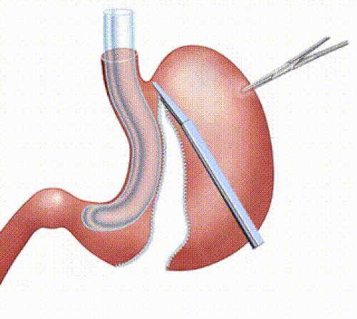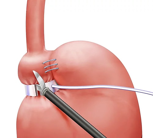 3. Mide kelepçesi ameliyatı, yemek borusunun mideye giriş yerinin çabucak altından mideyi bir kelepçe üzere sıkıştırarak yapılan bir formül.