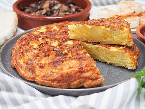 İspanyol Omleti; Yumurta ve patatesin soğan ve sarımsakla karıştırılması ve yağda kızartılmasıyla hazırlanan klâsik bir yemek.