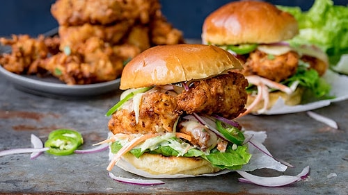 Hindileri bir kaseye koyun. Ayran, tuz, karabiber ve sarımsak tozunu ekleyin ve karıştırın. En az 1 saat marine olması için üzerini örtün ve buzdolabına koyun. Bir tavada sıvı yağı kızdırın. Marilenen hindileri evvel una sonra yumurtaya sonra da pankoya bulayıp tavada kızartın. Lahana ve havucu jülyen doğrayın. Mayonez, hardal, bal, limon suyu ve karabiberle bir kaseye koyun. Birlikte karıştırın. Hamburger ekmeklerini ısıtın içerisine salatadan ve çıtır hindilerde koyup servis edin.
