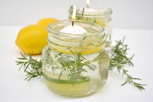 Kavanozu yaklaşık 3/4 oranında suyla doldurun. Uçucu yağlarınızın her birinden 10 damla eklemeye başlayın ve karıştırın. Her birine 2 dilim limon ve lime koyun. 2 biberiye kolu ekleyin ve kalanını su ile doldurun. Yüzen mumu yerleştirin ve istediğiniz vakit yakın. Taze tutmak için su ve meyveyi haftada iki kere değiştirin.