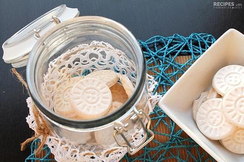 Suyu kaynama noktasına kadar ısıtın ve esansı ekleyin. Sıvıyı kabartma tozu içeren bir kaseye yavaşça karıştırın. Suyu da ekleyip elde ettiğiniz macunu silikon muffin kaplarına paylaştırın. Disklerin büsbütün kurumasını bekleyin. Bu birkaç gün alabilir. Büsbütün kuruduktan sonra, diskleri muffin kaplarından dikkatlice çıkarın. Kullanıma hazır olana kadar bir kavanozda saklayın.