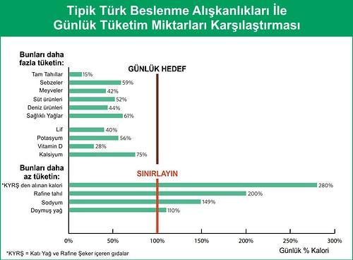 Aşağıdaki tabloda ise, halihazırda Türkiye'deki yeme alışkanlıklarının, günlük almamız gereken besin dağılımının istikrarlı formda olmasına mahal vermediğini görüyoruz.