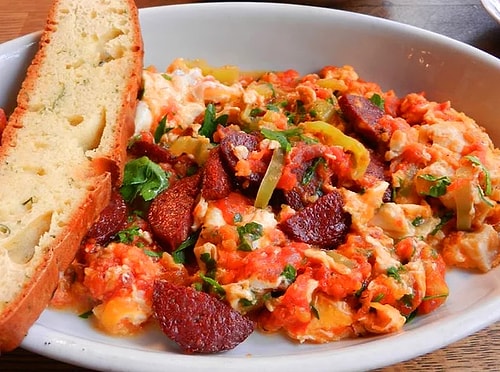 Yemeklik doğradığınız soğanları yağ kızdıktan sonra düşük ateşte soğanlar kahverengi renk alana kadar pişirin. Soğanların rengi saydamlaştığında biberleri ve sucukları ekleyin. Domatesi kabuklarını soyun ve küp küp doğrayın. Tavaya atıp suyunu çekene kadar pişirin. Sonrasında yumurtaları kırın. Karıştırmadan 3 dakika pişirin. 3 dakikanın sonunda çatalla sarılarını dağıtın ancak bulamaç yapmamaya dikkat edin. Tuzunu ve karabiberi ek edin.