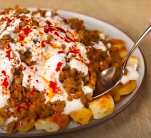 Kesme makarnayı yumuşayıncaya kadar haşlayın. Haşlanmış makarnanın suyunu süzüp kenarda soğutun. Yeşil mercimek bilene kadar haşlayın. Kıymayı teflon bir tavaya alıp birinci evvel biraz kavurun, sonrasında sıvı yağ ve ince doğranmış soğanı koyup soğanlar pişene denk kavurun ve salçayı ekleyip biraz karıştırdıktan sonra haşlanmış yeşil mercimeği ve tuzunu ek edip 1 su bardağı su ile pişirin. Soğumuş makarnayı yoğurtla karıştırıp pişen mercimeği biraz soğuttuktan sonra makarnanın üzerine dökün.