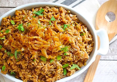 Soğanları uzun uzun dilimleyin. Yağ ile birlikte tencereye koyun. Düşük ısıda kavurarak pişirin. Mujaddarada soğanları karamelize etmek gerekiyor. Soğanlar kahverengi olana kadar karıştırarak pişirmeye devam edin. Karamelize olduktan sonra soğanların yarısını bir kenara ayırın. Tencerede kalan soğana tüm baharatları ve tuzu ekleyin. 1 dakika boyunca baharatlarla soğanları karıştırarak pişirin ve zerzevat suyunu ekleyin. Daha sonra pirinç ve mercimekleri ekleyin ve tencereyi kapatın. Isıyı yüksek düzeye getirerek suyun kaynamasını sağlayın. Kaynadıktan sonra ısıyı en kısığa alıp 30 dakika boyunca yemeği pişirin. 30 dakika sonra tencerenin kapağını hiç açmadan 10 dakika dinlendirin. Daha evvelden ayırdığınız karamelize soğanlarla birlikte servis edin.