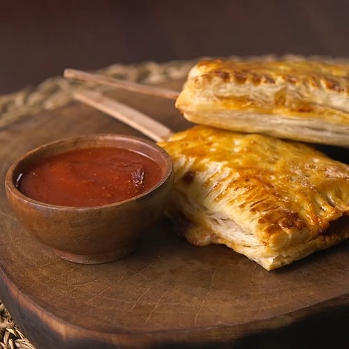 Milföyleri yavaşça açın. Sonrasında ikiye kesin ve içine pizza gereçlerini koyun ve üstlerini kapatıp kenarlarını çatal ile bastırın. Üzerine yumurta sarısı sürüp, 190 derecelik fırında 15 dk pişirin.