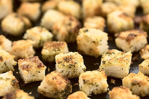 Ekmekleri küçük küpler halinde doğrayın ve bir fırın tepsisine alın. Bir kaseye zeytinyağını ve ezilmiş sarımsağı koyun, baharatları ve tuzunu da ek edip uygunca birbirine yedirin, bu karışımı ekmeklerin üzerine döküp düzgünce harmanlayın. Ekmeklerin her yerine baharat karışımı geldiyse 175 dereceli fırına verin ve ekmekler güzelce kuruyana kadar fırında bırakın orta ara karıştırın. Krutonlarınız hazır, artık soğuyunca bir kavanoza koyun ve dilediğiniz üzere ister çorbada ister salatada isterseniz de cips olarak tüketebilirsiniz.