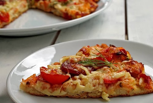 Bayat ekmekleri küpler halinde doğrayın. Derin bir kaba aldığınız ekmekleri süt, yumurta ve sıvı yağ ile harmanlayarak uygunca karıştırın. Hazırladığınız hamuru fırın tepsisine yayın. Sos gereçlerini bir kapta çırpın. Sosu tepsiye yaydığınız hamurun üzerine dökün. Daha sonra pizzanın üzeri için eklenecek gereçleri hazırlayın ve domates-biberleri ince ince doğrayıp ekleyin. Sosis ve sucukları da ekledikten sonra kaşar peynirini ek edip 200 derece fırında kaşarlar eriyene kadar pişirin.