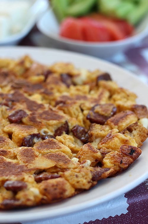 Ekmekleri küp biçiminde doğrayın. Bir kapta yumurtaları hafif çırpın. Ufalanmış peynir, küp doğranmış sucuk, doğranmış biberler, ekmek ve baharatları ekleyerek karıştırın. Tereyağını büyük bir tavada eritin. Yumurtalı karışımı tavaya yayın ve kısık ateşte pişirin. Bir tarafı piştikten sonra bir kapak yardımıyla öbür tarafını çevirerek pişirmeye devam edin. Sıcak servis yapın.