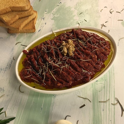Zeytinyağını küçük bir tavda kızdırın. Sarımsakları rendeleyin. Biber ve domates salçasını ekleyip kısık ateşte, kokusu çıkana kadar kavurun. İnce çekilmiş ceviz içini katıp yağının çıkmasını bekleyin. Akabinde tüm baharatları sırayla içerisine ekleyin. Rendelenmiş sarımsakları 1 dakika kadar karıştırdıktan sonra ocaktan indirelim. Soğuması için bir kenarda bekletin. İnce çekilmiş bayat ekmek içiyle kıvamını ayarladığınız kahvaltılık sosu cam kaplarda koruma edin.