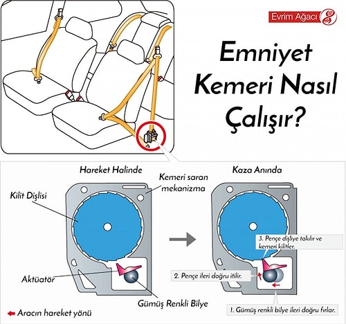Emniyet kemerinin sarılma ve salınma ölçüsünü denetim eden dişlinin altında ufak bir kilit düzeneği bulunur. Kemer çok süratli bir formda çekildiğinde yahut kaza anında, bu kilit sisteminin bir modülü olan genelde gümüş renkli bir bilye ileri hakikat fırlar. Bu fırlama hareketi sırasında, sistem içerisindeki kilit de üst yanlışsız itilir ve kemeri salınımını denetim eden dişliye takılıp kalır. İşte bu noktada kemer kilitlenip olduğu yerde kalır, böylelikle yolcu ileri yanlışsız fırlamaktan kurtulur. Yavaş çekildiğinde de kestirim edileceği üzere bilye ileri fırlamaz ve uzunluğunu istenilen biçimde kolay kolay ayarlanabilir.