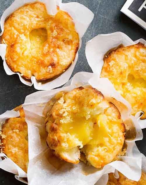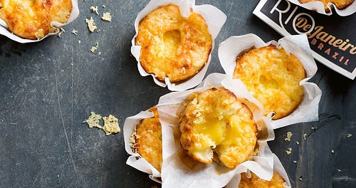 Fırını 200 dereye ısıtın. Sütü ve yağı bir tencereye koyun. Tuz ve karabiber serpin. Orta ateşte kaynayana kadar pişirin. Bir mutfak robotuna aktarın. Pirinç unu, kabartma tozu ve yumurta ekleyin. Materyaller karışana kadar robottan geçirin. Parmesanı ve 100 gram kaşar peynirini rendeleyin. 2 yemek kaşığı parmesanı bir kenara koyun. Mutfak robotuna peynirleri aktarın, tekrar karıştırın. Karışımı muffin kaplarına doldurun. Kalan kaşar peyniri küçük karelere bölün ve her muffin kabına 1 adet batırın. Ayırdığınız 2 yemek kaşığı parmesanı üzerlerine serpin. 20 dakika pişirin.