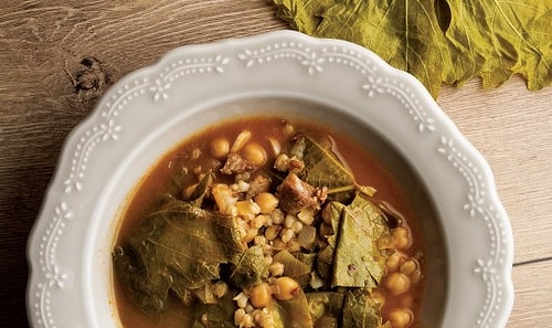 Düdüklü tencerenin içerisine yağı, soğanı ve sarımsağı ekleyerek kavurun. Üzerine kuşbaşı doğradığınız eti ek edin ve kavurmaya devam edin. Et kavrulunca salça ekleyin ve daha sonra doğradığınız asma yapraklarını ekleyin. Üzerine evvelden haşladığınız nohut ve yarmayı ek edin. Şayet salamura yaprak kullanacaksanız tuzu az ekleyin. Son olarak et suyunu ekleyin. Üzerini geçecek kadar su ekleyin ve düdüklünün kapağını kapatın. Yaklaşık yarım saat pişirin.