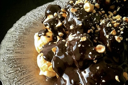 Ardından profiterolleri ortadan ikiye kesip içini krema ile doldurun ve üst üste dizin. Son olarak da benvari yöntemi erittiğiniz bitter çikolata sosunu profiterollerin üzerine dökün. Servise hazır.