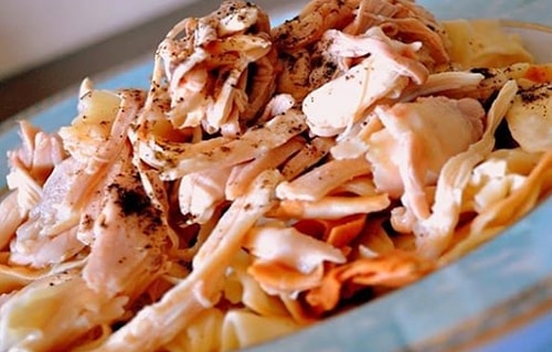 Tavuğu haşlayın ve didikleyin.