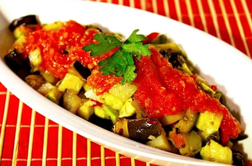 Patlıcanları soyun ve küp küp doğrayın. Sıvı yağı kızdırın. Patlıcanları ve biberleri tuzlayın, başka ayrı kızartın. Havlu kâğıt ile fazla yağını çektirin. Zeytinyağını, soğanı ve sarımsağı solana kadar tavada çevirin. Domates ve şekeri ekleyin. Suyunu çekene kadar pişirin, tuzunu serpin. En sonunda ise domates sos ile kızarttığınız zerzevatları harmanlayıp servis edin.
