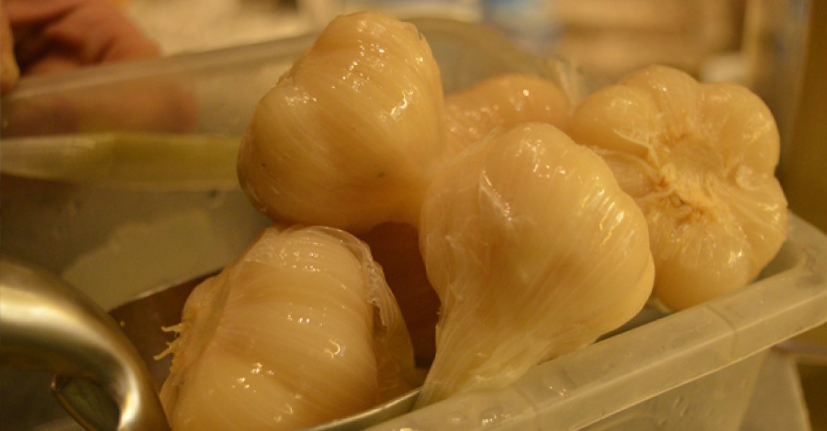Sarımsakların zirvelerini kesin lakin katiyen soymayın. Sarımsakları bir gece evvelden suya koyun ve en az 10-12 saat suda bekletin. Bu evrede sarımsağın suyunu iki-üç kere değiştirin.