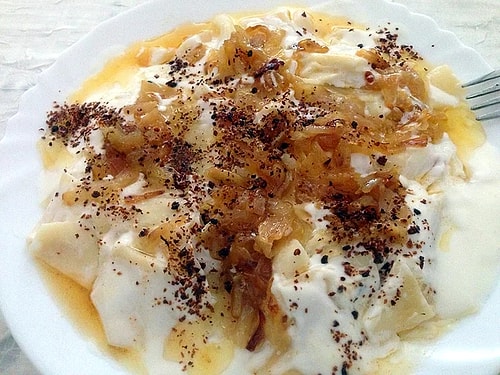 Yoğurda ezdiğimiz sarımsakları ekleyerek karıştırıyoruz. Tabağımıza kevgir yardımıyla hamurdan yoğurttan ve sostan döküp afiyetle yiyoruz. Sumak yahut pul biber ekebilirsiniz.