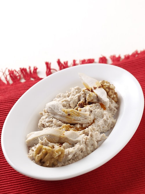 Ekmek içlerini ıslatıp, yeterlice sıkın. Ekmek içi, ceviz, sarmısak ve tuzu harmanlayın. Robotta, karışım koyu mulallebi kıvamına gelinceye kadar piliç suyu ek ederek karıştırın. Pul kırmızı biber ve zeytinyağını küçük bir kapta karıştırın ve rengi çıkıncaya kadar bekletin. Göğüs etlerinden bir ölçü ayırın. Kalan etleri hazırladığınız harcın yarısı ile karıştırıp, servis tabağına yayın. Kalan harcı üzerine gezdirin. Ayırdığınız etleri harcın üzerine yerleştirin. Kırmızı biberli yağı gezdirerek servis yapın.