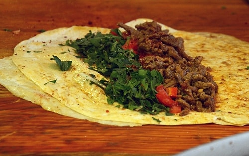 Eti minik minik doğrayın ve haşlayın. Domatesleri küp küp doğrayın. Soğanı ince ince doğrayın ve maydanozu kıyın. Soğanı ve maydanozu sumakla birlikte harmanlayın. Tencerenin içerisine sıvı yağı koyun. 1 su bardağı sıcak su ve haşlanan etleri de ekleyerek toz kırmızı biber ve tuzunu atın. Bir kaç dakika kavurun. Etler pişerken lavaşları etlerin üzerine kapatarak yağlanmasını ve etin tadını almasını sağlayın. Daha sonra lavaşların içine doğradığınız domatesleri ve sumaklı soğan karışımını yayın. Üzerine pişen etlerinizi ekleyin ve lavaşları sıkıca sarın.