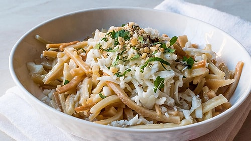 Tencerede suyu kaynatın erişteleri atmadan evvel zeytinyağını ve tuzunu ekleyin. Erişteleri kaynar suya atın ve 8-10 dakika kaynatın. Suyunu çekmesine yakın kuru üzümü ekleyin. Maydanoz ve dereotunu ince ince kıyın, peyniri küçük modüllere bölün, ceviz ve sarımsağı havanda dövün. Tüm materyalleri erişteye ekleyerek karıştırın. 2-3 dakika daha pişirin ve sıcak sıcak servis yapın.