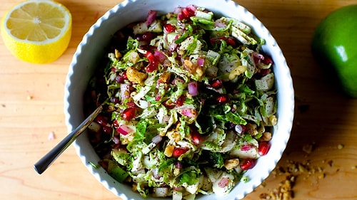 Bütün yeşillikleri sirkeli su ile uygunca yıkayalım. Bütün yeşillikleri doğrayalım. Üzerine ceviz, nar ve doğradığımız kornişon turşularını ekleyelim. Farklı bir kapta sirke, limon suyu ve kabuğu, tuz ve zeytinyağını düzgünce karıştırıp salatamıza ekleyelim. Dilerseniz salataya reyhan, fesleğen üzere yeşillikler de ekleyebilirsiniz.