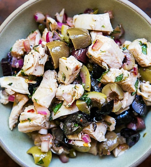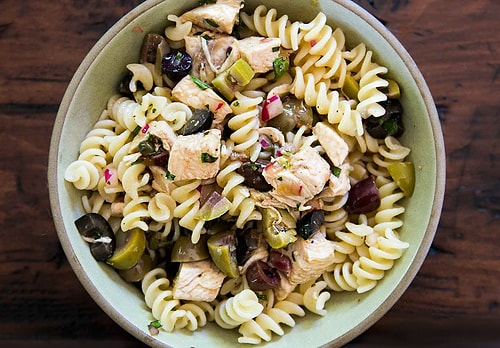 1,5 litre suyu kaynatın ve bir ölçü tuz ekleyin. Makarnayı haşlayın. Tavuk göğsünü çapraz olarak ikiye bölün ve suya koyun. Isıyı düşük düzeye düşürün ve tavuğu haşlayın. Tavuk haşlandıktan sonra doğrayın. Tüm salata gereçlerini derin bir kabın içerisinde harmanlayın.