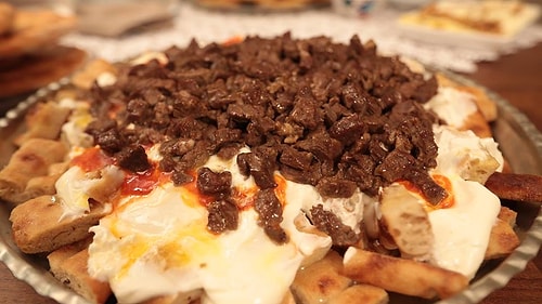 Etler piştikten sonra et suyu ile fırınlanan pideleri ıslatın. Üzerine etleri koyun. Etlerin üzerine de yoğurdu dökün.