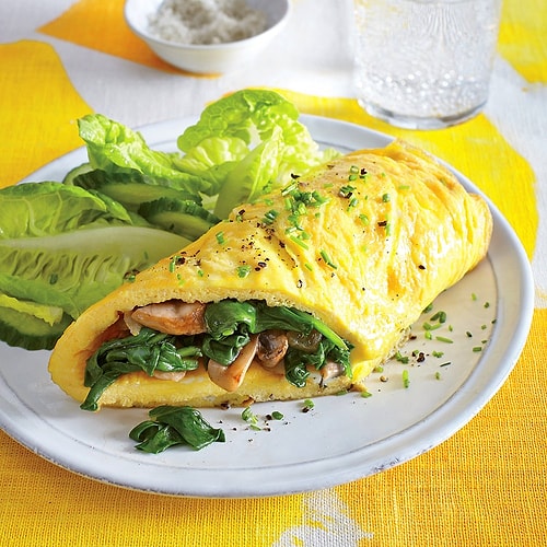 Tavuğu kuşbaşı doğrayıp yağda suyunu salıp tekrar çekinceye kadar pişirin. Temizleyip doğradığınız mantarları ekleyerek pişirmeye devam edin. En son ıspanakları doğrayıp ekleyin. Ocaktan almadan evvel tuz ve karabiber ekleyin. Başka bir kasede yumurtaları süt ile çırpın. Akabinde tuz ve karabiber ekleyin. Yağlanmış tavayı ocağa koyun ve ısıtın. Yumurtalı karışımı tavaya dökün. Bir tarafı uygunca piştikten sonra karşıt çevirin ve öteki tarafını da pişirin. Servis tabağına omleti alıp üzerine ıspanaklı karşımı aktarın. Dürüm halinde sarıp servis edin.