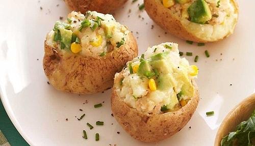 Fırını 200 dereceye evvelce ısıtın. Patatesleri 5-6 yerinden delin. Bir fırın tepsisine koyun ve 45 dakika yumuşayıncaya kadar pişirin. Patatesleri ikiye bölün, içini oyun ve bir kabın içerisinde düzgünce ezin. Ton balığı, mısır, avokado ve ince kıyılmış taze soğan ekleyin. Güzelce karıştırın. Tuz ve karabiber serpin. Karışımı patates kabuklarına dökün. Peynir serpin ve 15-20 dakika fırında pişirin.