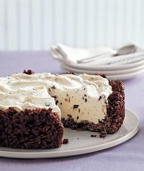 Çikolatayı mikrodalga ya da benmaride eritin. Daha sonra nane aroması ve pirinç patlaklarıyla karıştırıp bir kelepçeli kalıba taban yapın. Buzlukta 30 dk dondurup üzerine dondurmayı ekleyip yaklaşık 2 saat daha dondurun.