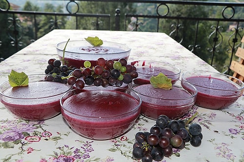 Siyah üzümü düzgünce yıkayın. Suyla birlikte bir tencerede kaynatın. Toz şekeri ekleyip 5 dakika daha kaynatın. Süzgece alıp elinizle bastırarak suyunu süzün. Üzüm suyundan 1 su bardağı ayırıp nişastayla birlikte karıştırın. Pürüzsüz hale getirin. Kalan üzüm suyuna ekleyip daima karıştırarak pişirin. Küçük kaselere ya da kalıplara sıcak olarak paylaştırın. Buzdolabında güzelce soğutup katılaşınca servis tabağına aykırı çevirin. Üzümlerle süsleyip servis yapın.