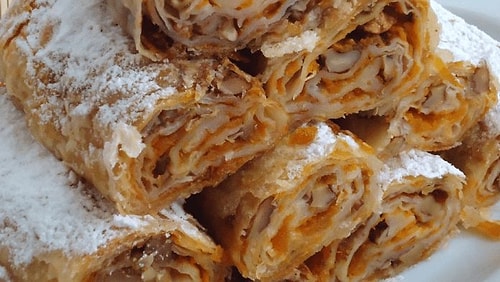 Karıştırma kabımıza unu alalım ve ortasını havuz üzere açıp içine 1 adet yumurta kıralım. Yeteri kadar su ek ederek kulak göğsü kıvamına ulaşana kadar yoğuralım. Hamurumuzun üzerini nemli bir bezle kapatarak 10-15 dakika kadar dinlendirelim. Daha sonra dinlendirdiğimiz hamuru 5 eşit kesime bölerek bezeler hazırlayalım. Hazırlanan bezeleri un serpiştirilmiş açma tahtasına alarak böreklik yufkadan daha ince olacak biçimde yufkalar açarak pak bir örtü üzerine serelim. Tatlımızın iç materyalini hazırlamak için bal kabağının kabuklarını soyup çekirdeklerini ve içini temizleyerek rendenin kalın tarafı ile rendeleyelim. Rendelenmiş kabağın içine 1 su bardağı dövülmüş ceviz içi ve 1 su bardağı toz şeker ekleyip karıştıralım. Akabinde bez üzerine serdiğimiz yufkaların birinci açılanından başlayarak hazırladığımız kabaklı iç harçtan üzerine yayalım ve yufkayı 4 eşit modüle bölelim. Elimizle kenar kısımlarından başlayıp bükerek rulo halinde saralım. Fırın tepsimizi yağlayarak hazırladığımız ruloları tepsinin ortasından başlayarak yuvarlak daire halinde döşeyerek saralım. Tepsi dolana kadar kalan yufkaları da birebir biçimde hazırlayarak tatlımıza devam edelim. Akabinde bir tavaya 200 gram tereyağını ek edip eriterek kızdıralım. Sıcak tereyağını tepsideki hamurların üzerine eşit bir biçimde gezdirerek dökelim. Fırınımızı 185 dereceye ayarlayarak evvelce ısıtılmış fırında pembeleşinceye kadar pişirdikten sonra fırından alalım. Tatlımızın şerbetini hazırlamak için bir tencereye 2 kg toz şeker ve 5-6 su bardağı su ek ederek kaynayana kadar harlı ateşte şerbet kaynadıktan sonra ise kısık ateşte 10-15 dakika kaynatarak yarım limon suyu ekleyerek bir iki taşım daha kaynatarak hazır hale gelen şerbeti ocaktan alarak soğumaya bırakalım. Şerbet uygunca soğuduktan sonra yavaşça ılıttığımız tatlımızın üzerine gezdirerek döküp tepsinin üzerini pak bir bezle kapatarak şerbetin çekmesi için bekleterek servise sunalım. Dilerseniz üzerine pudra şekeri serpebilirsiniz.