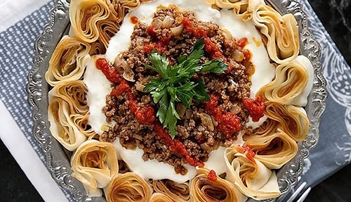 Sironları fırına girebilecek bir borcam ya da kap içine yan yana dizin. Kıymalı harç için yemeklik doğradığınız soğanı 1 yemek kaşığı tereyağı ile orta uzunluk bir tencerede pembeleşinceye kadar kavurun. Kavurduğunuz soğanlara kıymayı ek edin ve suyunu salıncaya kadar kavurun. Tencereye salçayı ekleyin ve kavurmaya devam edin. Suyu, tuzu ve karabiberi ekleyerek suyunu çekinceye kadar orta sıra karıştırarak pişirin ve ocaktan alın. Bir kap içine dizdiğiniz sironlara sıcak et suyunu kepçe ile ek edin. Suyunu çekmeye başladığında 180 derece evvelden ısıttığınız fırına alın ve 5-10 dakika kadar pişirin. Fırından çıkan sironların üstüne sarımsaklı yoğurdu bir kaşık yardımıyla yayın. Üstüne kıymalı harcı dökün ve isteğe nazaran biraz maydanoz ekleyerek servis yapın.