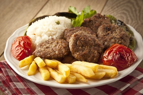 Ekmek içlerini robottan geçirin. Ekmekleri bir tepsiye yayıp üzerlerini tülbentle örtün. Güzelce kurumaları için bir gece bekletin. 100 gram yağlı kuzu boşluk etini ve 500 gram dana kıyma etini kıyma makinasından birlikte çektirin. Şayet iki kıymayı birlikte çektiremediyseniz, iki kıymayı ekmek içiyle birlikte 5 dakika kadar yoğurun. Sarımsak, tuz ve karabiberini ek edin. Bütün harcı rulo hale getirin. Buzdolabında 30 dakika dinlenmeye bırakın. Dinlenen ruloyu bıçak kullanarak porsiyonlara ayırın. Avuç içlerinizle bastırarak şekillendirin. Izgara tavayı yavaşça yağlayın ve yeterlice ısıtın. Köfteleri ızgara tavada önlü gerili güzelce kızartın. Domates ve biberleri de tavaya dizip yavaşça közleyin. Köfteleri ve közlenmiş zerzevatları servis tabağına yerleştirip çabucak sıcak servis edin. Afiyet olsun.
