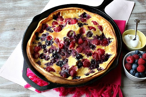 Tereyağını tavaya alın ve eritin. Fırını 200 dereceye ayarlayın. Sonrasında yumurta, un, süt, şeker, limon kabuğu ve tuzu yeterlice çırpın. Karışımı tavaya alın ve üzerine meyveleri koyup 20 dk fırında pişirin. Pudra şekeri ve bal ile süsleyerek servis edin.