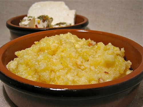 Bakır ya da teflon tavamıza 2 yemek kaşığı tereyağını koyup eritin. 4 yemek kaşığı mısır ununu ve tuzu ekleyip unu kavurun. Hafif rengi dönüp kokusunu verince 2 su bardağı soğuk suyu da yavaş yavaş ekleyin. Topaklanma olmaması için karıştırın. Altı kısık bir halde suyunu çekip yağını üzerine verinceye kadar yaklaşık 5 dakika pişirin. Bu evrede peynirli karışımı ekleyip fazla karıştırmadan peynir eriyip tekrar yağı yüzüne çıkınca altını kapatın ve sıcak sıcak servis edin.
