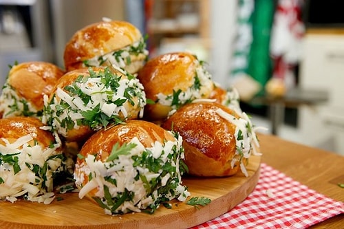 Ilık suyun içine maya, toz şeker ve 1 yemek kaşığı un ekleyerek 10 dakika kadar bekletin. Bir kabın içine 3 su bardağı elenmiş un koyun. Üzerine mayalı su, süt, tuz ve sıvı yağ ekleyip yoğurmaya başlayın. Gerekli görülürse un ekleyerek, ele yapışmayan yumuşak bir hamur hazırlayın. Hazırladığınız hamurun üzeri örtülü bir halde yaklaşık 45 dakika kadar mayalanması için dinlendirin. Mayalanan hamurdan modüller alınmadan evvel ellerinizi yavaşça yağlayın. Daha sonra ceviz büyüklüğünde modüller kopartıp elinizde fazla bastırmadan yuvarlayarak şekillendirin. Hazırladığınız minik poğaçaları yağlanmış fırın tepsisine sıralayın. Tepside mayalanması için 10 dakika dinlendirin, üzerlerine sıvı yağ ve yumurta sarısı karışımı sürün. 170° fırında üzerleri kızarıncaya kadar pişirin. Maydanozlar ince ince kıyılarak hazır edin. Pişen poğaçalar soğuduktan sonra büsbütün kesmeden yatay olarak ortalarından bölün. Daha sonra içlerine 1 tatlı kaşığı kadar krem peynir sürüp kapatın.