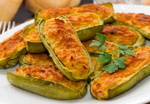 Bir tencerede su kaynatın. Kaynayınca içerisine tuz atın. Fırını 180 dereceye ısıtın. Kabakların sap kısımlarını kesip, uzunluktan boya 2 eşit modüle bölün. Çok inceltmeden, iç kısmını bir kaşık yardımıyla oyun. Kabakları kaynayan suya atın ve haşlayın. Haşlarken çok yumuşamasına müsaade vermeyin ki kırılmasın yahut lezzetini yitirmesin. 3 dakika kadar haşlayıp, soğuk su dolu bir kaba alın. Kurutulmuş domatesleri minik minik kesin, cevizleri iri iri modüllere ayırın, taze kekiği kıyın. Kabak ve kaşar dışındaki bütün materyalleri bir kaba alarak güzelce karıştırın. Kabakları suyun içerisinden çıkarın ve sularını süzdürün. Yağlı kağıt serdiğiniz bir fırın tepsisi üzerine kabakları dizin ve içerisini iç harç ile doldurun. Üzerlerine kaşar peyniri serpin ve fırına verin. Üzerleri kızarınca fırından çıkarabilirsiniz.